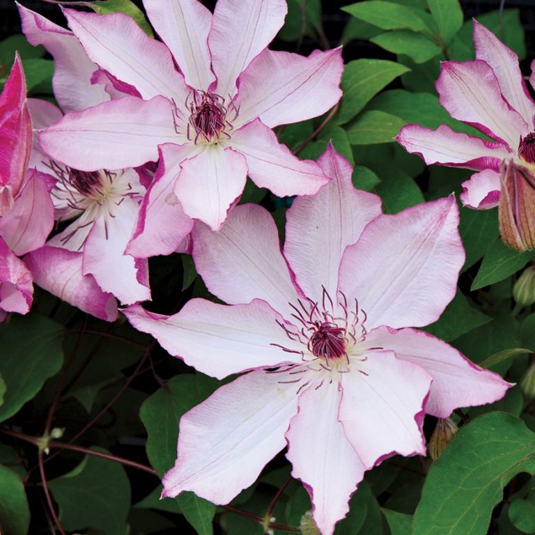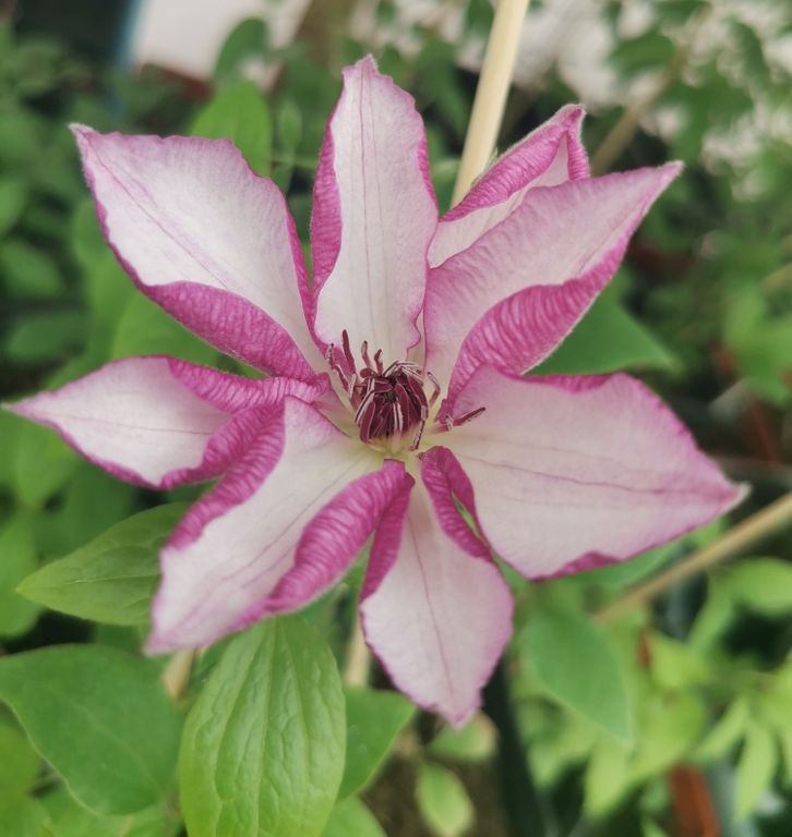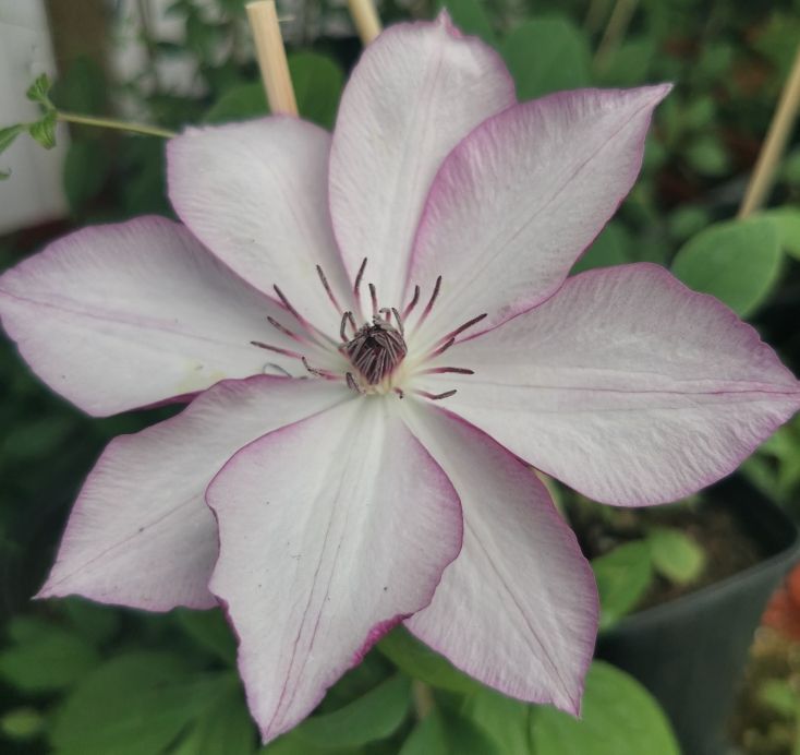 Имеет белые или светло-розовые цветки с розовыми краями лепестков. Цветки диаметром около 16 см, с 6-8 лепестками, розовыми с нижней стороны. Тычинки с фиолетово-красными пыльниками .